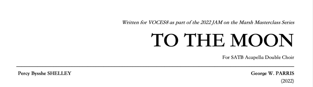 Premiered by the Voces8 scholars as part of JAM on the Marsh's 2022 masterclass series, To the Moon is an original work for SATB acapella double choir setting the poet Percy Bysshe Shelley's poem of the same name to music.